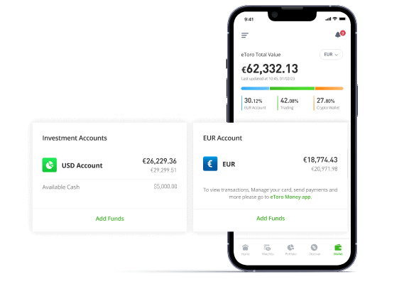On eToro, you’ll have access to leading local and global assets — plus insights from analysts and investors in your area, as well as from around the world. When you open a EUR account (also known as an eToro Money account), you add the flexibility to deposit, hold and fund trades in EUR or USD — whichever suits you at any moment.