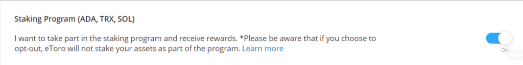 Staking applies to cryptoassets held in the eToro trading platform only.