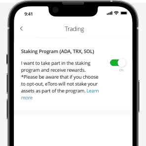 If you hold open positions in Cardano (ADA), Tron (TRX), Near Protocol (NEAR), Polygon (POL), Cosmos (ATOM), Polkadot (DOT) or Solana (SOL) and you are an eToro (Europe) Ltd user, you are now subject to MiCA regulation, and must actively opt into the service to stake your assets. Go to Settings > Trading > Staking Program, and move the button to the ON position.**